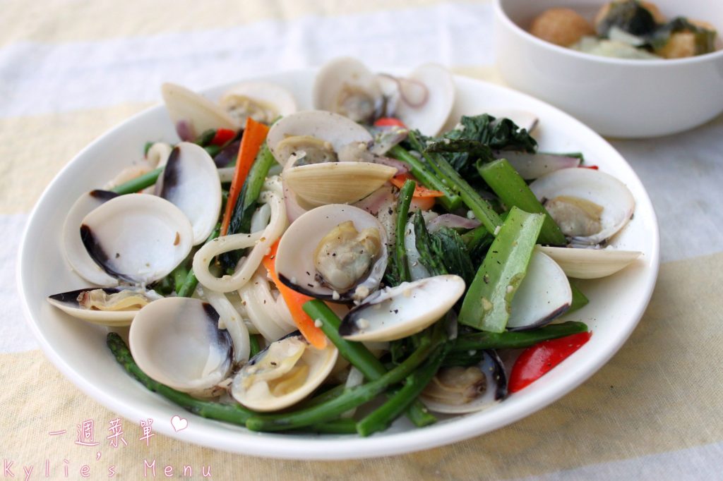 先把2/3的蛤蠣夾起來備用,依序加入蘆筍、辣椒、青菜拌炒,在加入一點鹽巴和一匙橄欖油