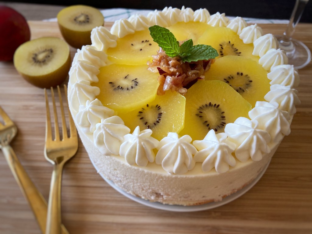 奇異果、鳳梨與水蜜桃都是夏天的水果,搭配起來很不錯。蛋糕特意將起司部分減少,有一層用優格代替創造了清爽的口感!